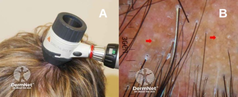 Figure 1. Trichoscopy in alopecia areata diagnosis. (A) Dermatoscope positioned on scalp for non-invasive trichoscopic examination. (B) Trichoscopic view of alopecia areata, showing characteristic yellow dots (red arrows) that represent empty hair follicles and sebaceous glands visible at the follicular openings. Images sourced from DermNet.