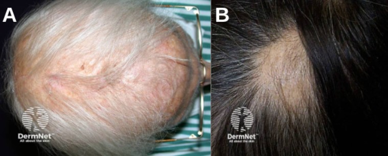 Figure 2. Clinical presentations of non-scarring alopecia subtypes. (A) Androgenetic alopecia in a female patient showing diffuse thinning and reduced hair density at the vertex with preservation of the frontal hairline. (B) Alopecia areata presents as a well-demarcated, round patch of complete hair loss on the scalp. (C) Traction alopecia affecting the temporal and frontal hairline, characterized by hair loss in areas of chronic mechanical tension from tight hairstyling. (D) Androgenetic alopecia in an older female patient with advanced diffuse thinning across the crown and vertex, demonstrating visible scalp and miniaturized hair follicles. All images sourced from DermNet.