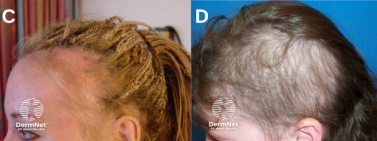 • Traction Alopecia: Chronic tension usually from tight hairstyles that can cause hair loss; when detected early, follicles remain alive, but lengthened traction can cause permanent damage (Al Aboud et al., 2024).