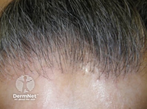 Figure 3. Clinical presentation of frontal fibrosing alopecia. Progressive hairline recession along the frontal and temporal margins with characteristic perifollicular erythema and loss of vellus hairs, typical of scarring alopecia in postmenopausal women. Image sourced from DermNet.