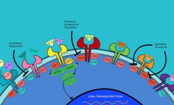 Figure 4. JAK-STAT Signaling Pathway and Therapeutic Targets in Alopecia Areata. Schematic illustration showing the mechanism of action of JAK inhibitors in blocking the JAK-STAT pathway, which is implicated in the autoimmune pathogenesis of alopecia areata. Various cytokine receptors activate JAK proteins, which trigger STAT-mediated DNA transcription. JAK inhibitors interrupt this cascade to reduce autoimmune follicle attack. Image sourced from DermNet.