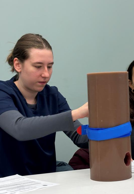 In the course, fellows learned how to recognize life-threatening bleeding and act quickly and effectively to control it. The first lesson was on the ABC’s of steps to take when there is severe bleeding: Alert 911, find the Bleeding, and Compress the wound. Fellows also practiced three quick and different techniques to control bleeding: applying direct pressure to a wound, packing a wound to control bleeding, and applying a tourniquet.